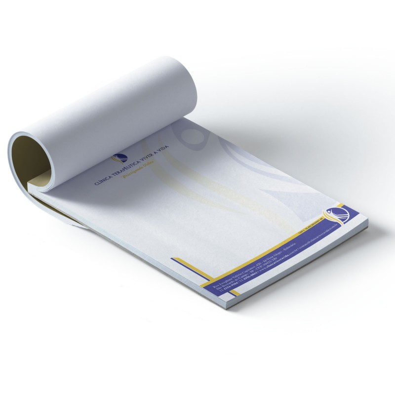 Medida: 10x15cmMaterial: Sulfite 90g, 120g e reciclado 90gAcabamento padrão: Blocado e coladoQuantidade de folhas: 50 folhasImpressão: 4x0 corProdução: 3 dias